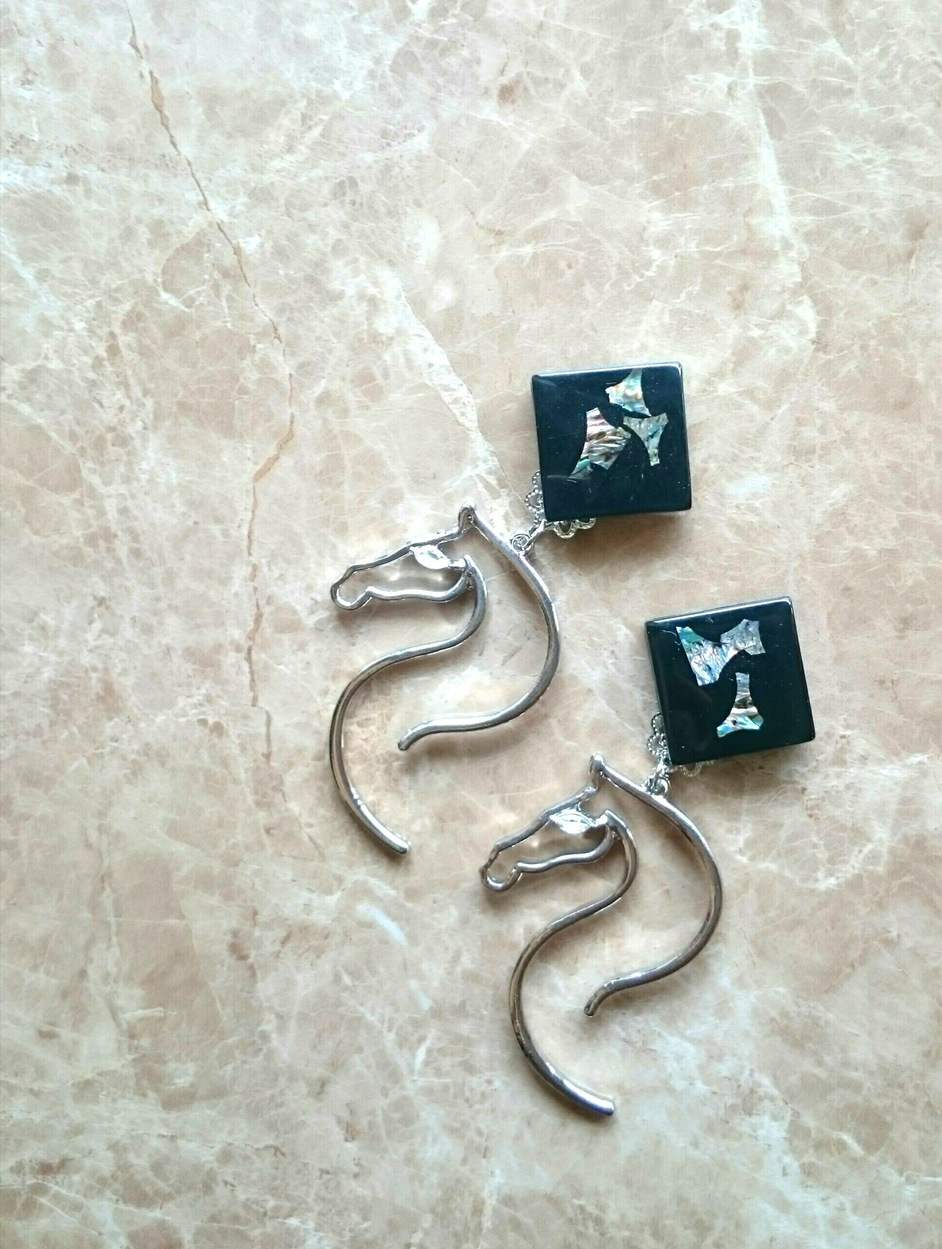 ドイツヴィンテージのシェルが埋め込まれた四角い黒パーツと馬モチーフの大ぶりなチャーム、それぞれのパーツを活かしたsimpleデザイン✨