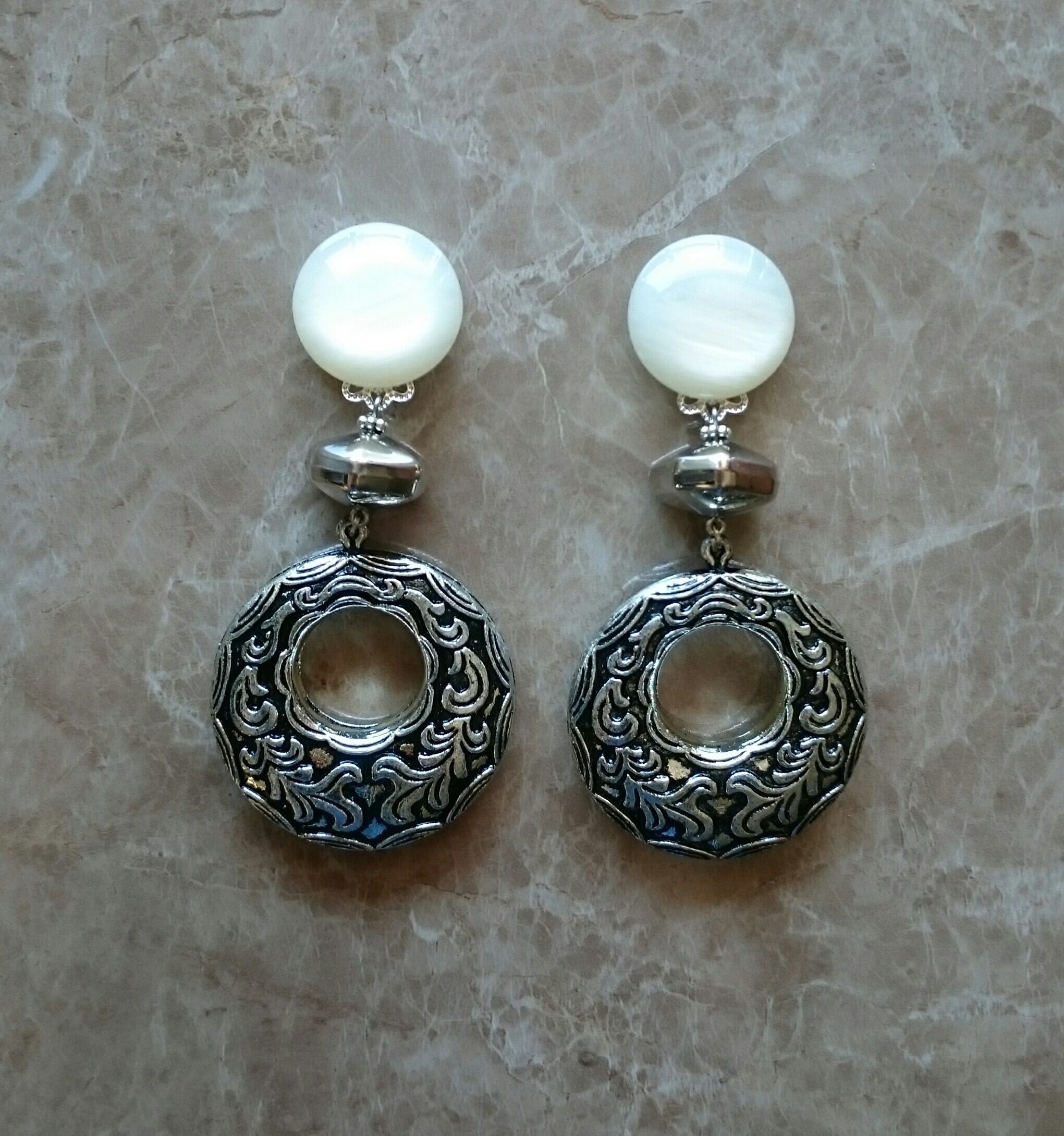 パールがかった優しいホワイトパーツに、対照的なアンティーク調の柄が素敵なBigリングを合わせて✨