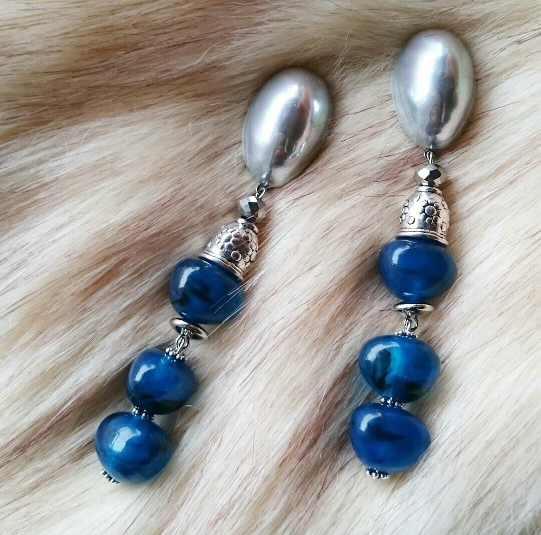 gray pearl (oval) × silver × blue beads 《再販なし》