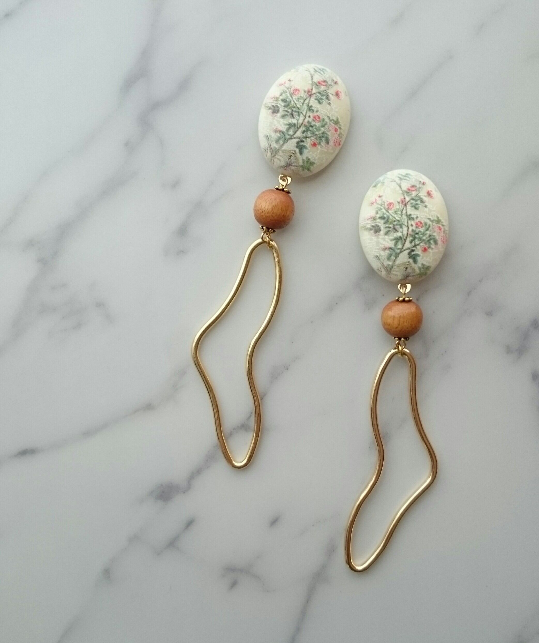 beige oval(antique print) × wood × gold long ring 《再販なし》