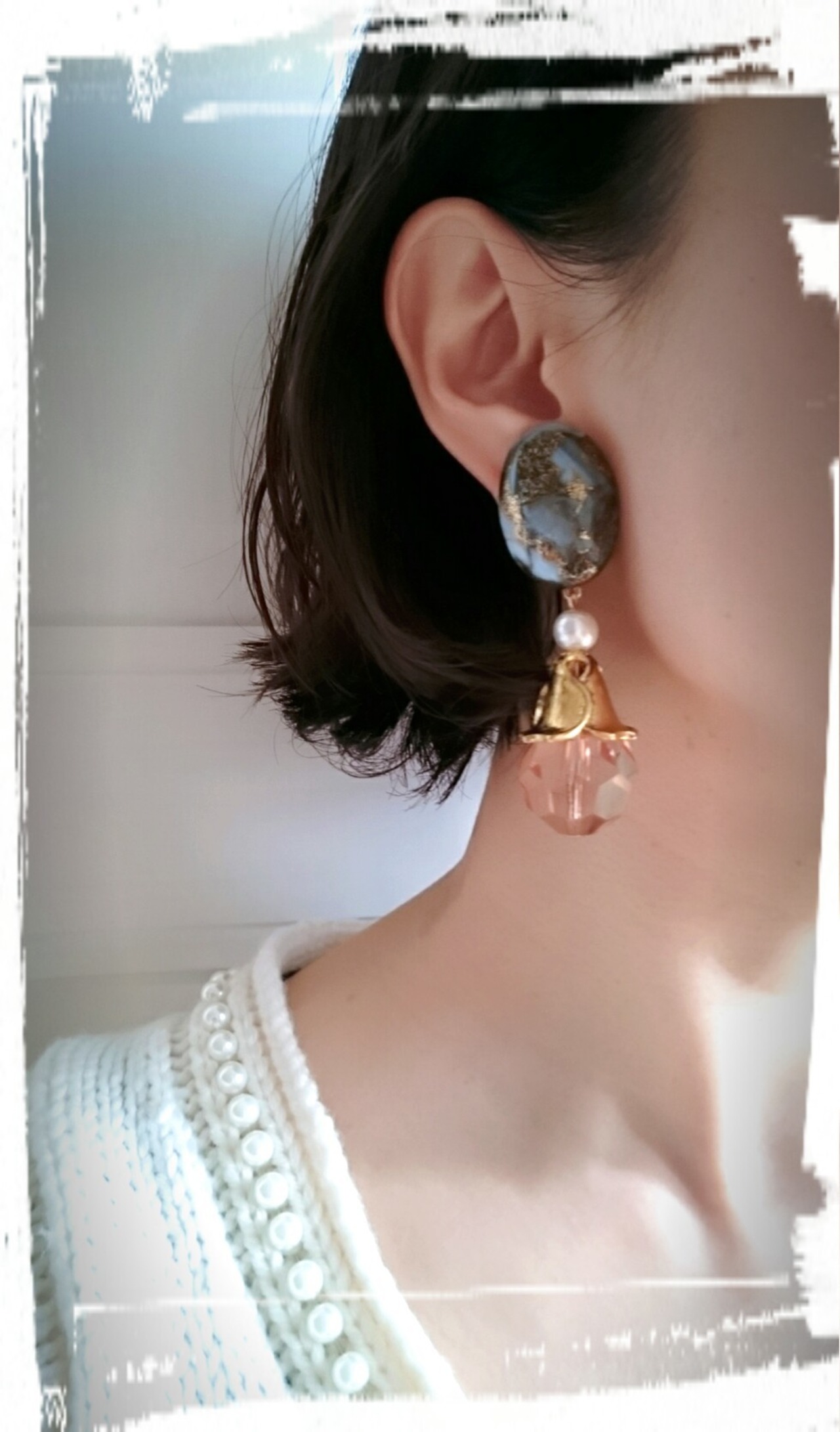 ゴージャス感のあるマーブルストーン(合成天然石)に、コットンパールを合わせて、高級感のある大人素敵なアンティークデザイン✨