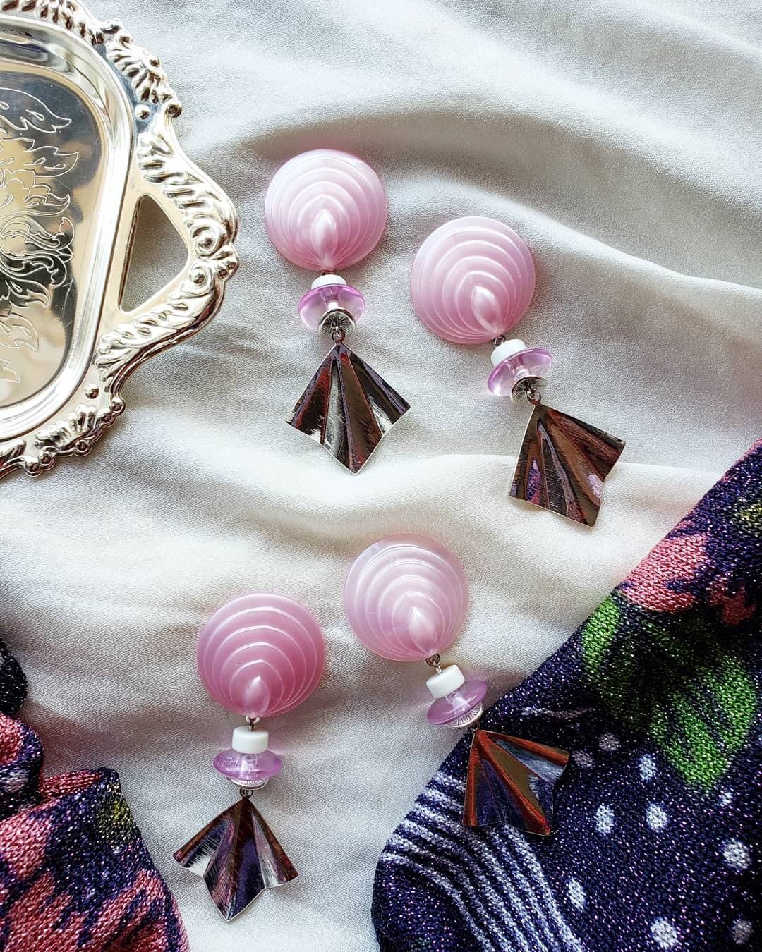 ほんのり色味の違うクリアピンクビーズと、個性あるシルバーパーツを合わせた、レトロ&バブリーな雰囲気漂うキュートデザイン✨
