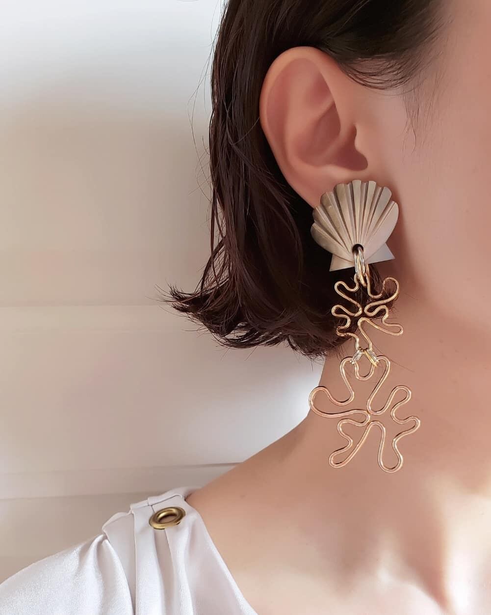 ブラウンのグラデーションがすてきな天然シェルに、インパクトあるフォルムで、大きさの異なる2つのゴールドパーツを合わせたロングデザイン✨