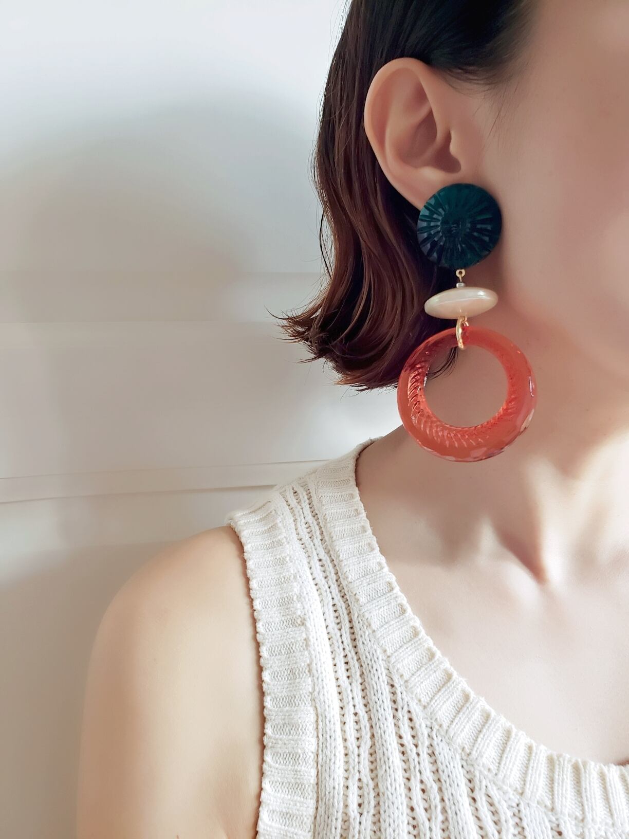 ブルーグリーンのクリアが魅力的なヴィンテージパーツに、珍しいオレンジレッドの、存在感あるクリアリングを合わせたcolorfulデザイン✨