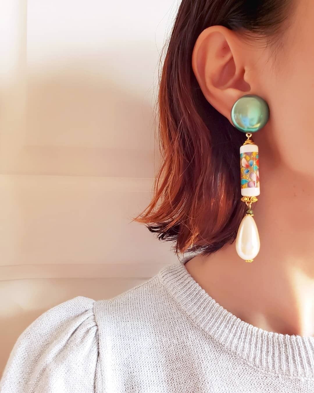 綺麗なCOLORが引き立つような、個性あるカラフル柄のヴィンテージビーズと、ドロップパールを合わせて✨