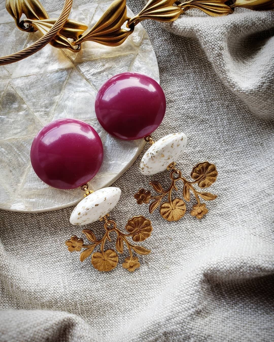 これからの季節に魅力的なワインレッド(又はボルドー、赤紫)をトップに、クラシックなお花のヴィンテージパーツを合わせた、個性ある大人素敵なデザイン✨