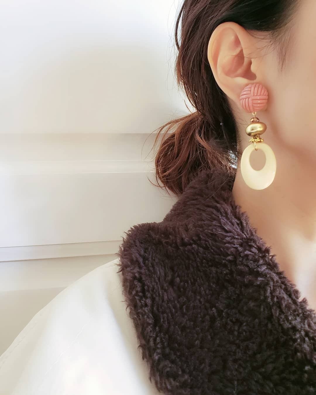 ナチュラルで優しい2つのパーツとは異なるイメージの、マットゴールド&ピンクのglassビーズを合わせた、