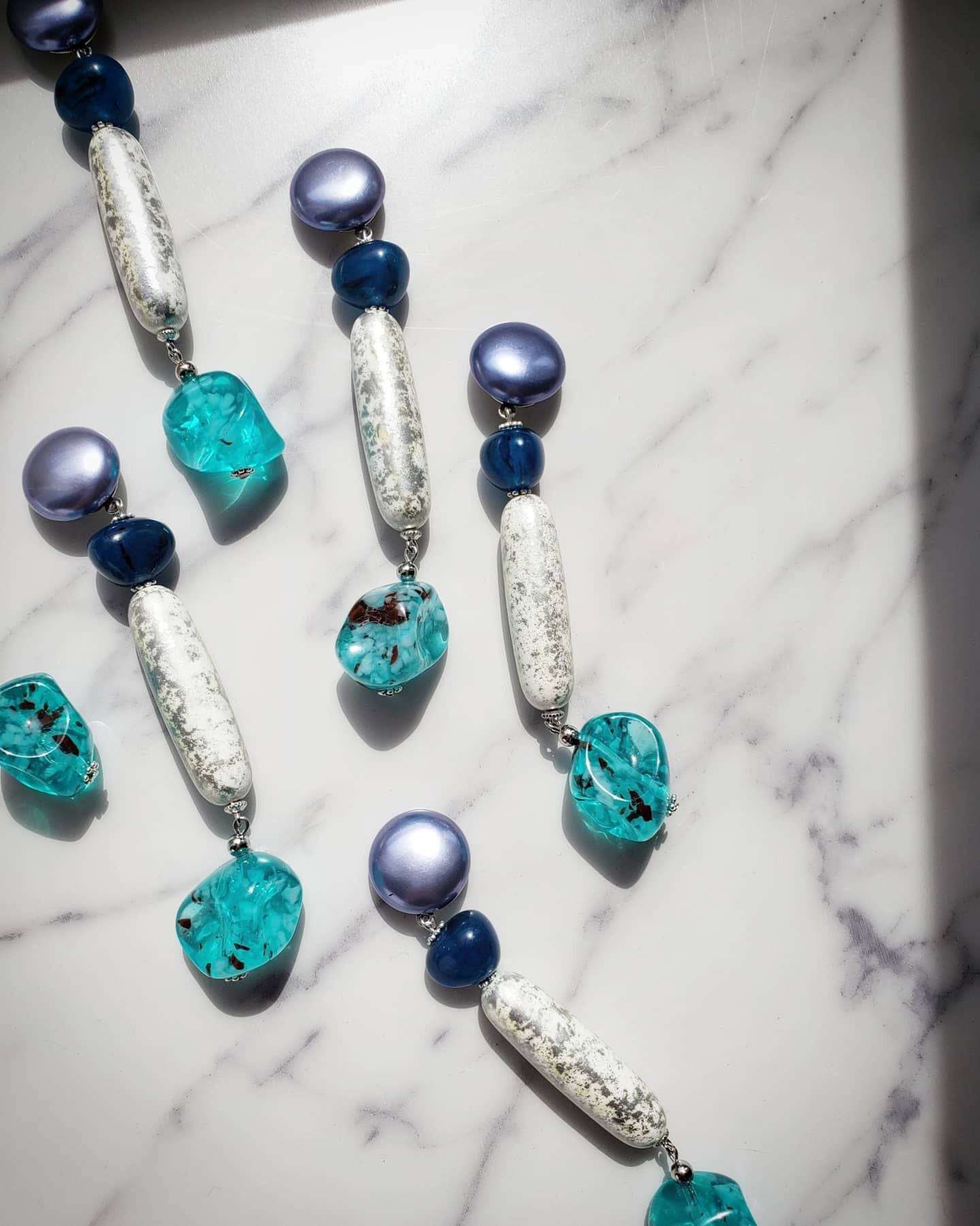 鮮やかなクリアミントブルービーズがアクセントになり、ユラユラと目を惹きます✨♥️ カラフルだけど、派手すぎない❕