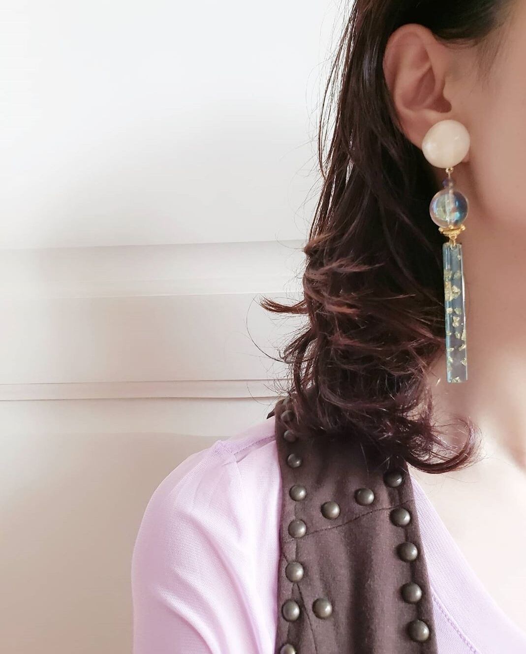 涼しげなアイボリーのヴィンテージパーツと、ゴールドチップが埋め込まれたクリアブルーのスティックパーツを合わせて✨