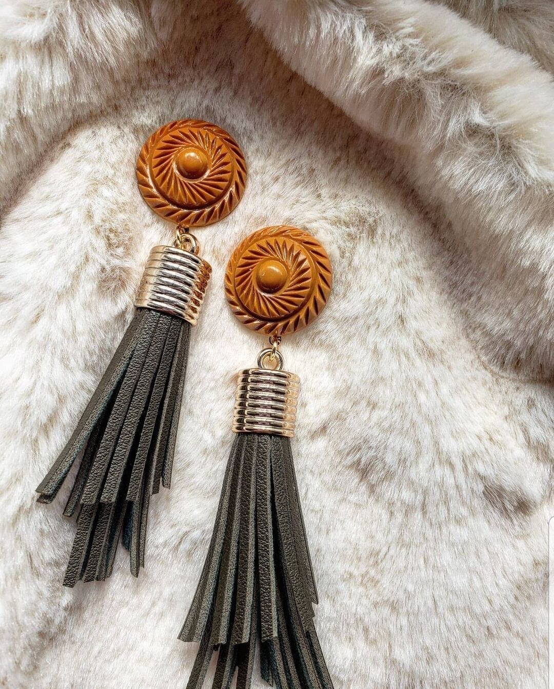 個性あるキャメルブラウンパーツと、カットが魅力的なカーキ色の大ぶりタッセルを合わせたシンプルデザイン✨
