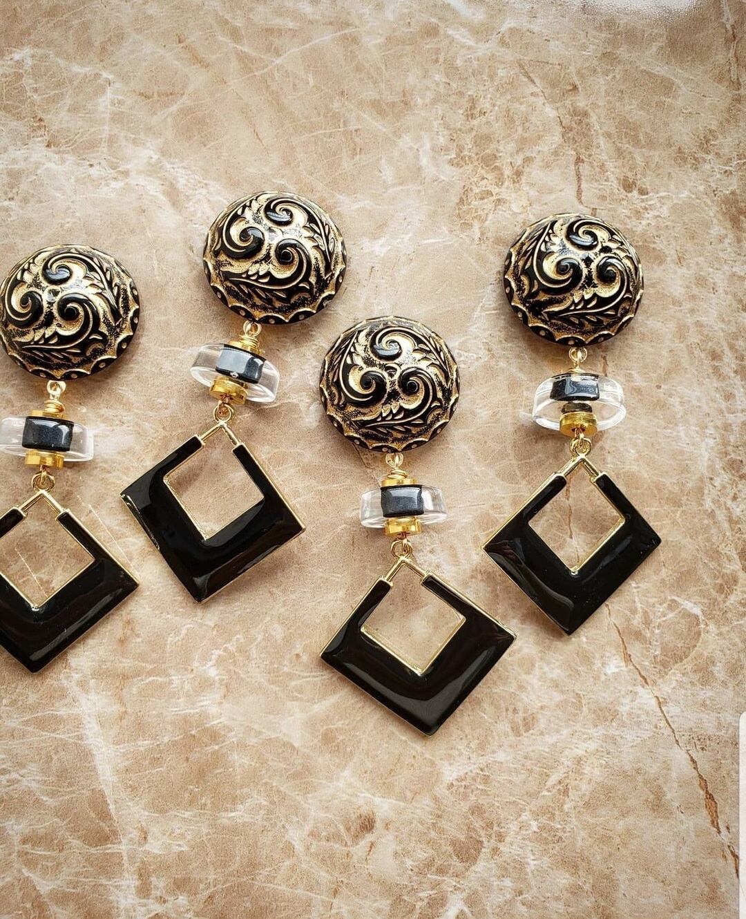 エナメルブラックが魅力的なスクエアパーツと、クリア&ブラックのヴィンテージビーズを合わせて、バイカラーなデザインに✨