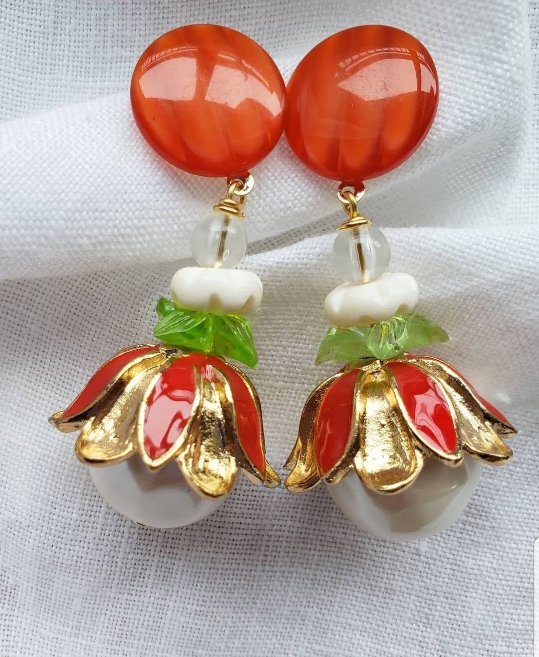 朱赤が可愛いヴィンテージパーツと、ホワイトのボーンビーズ、リーフモチーフの蛍光グリーンビーズをアクセントに✨♪