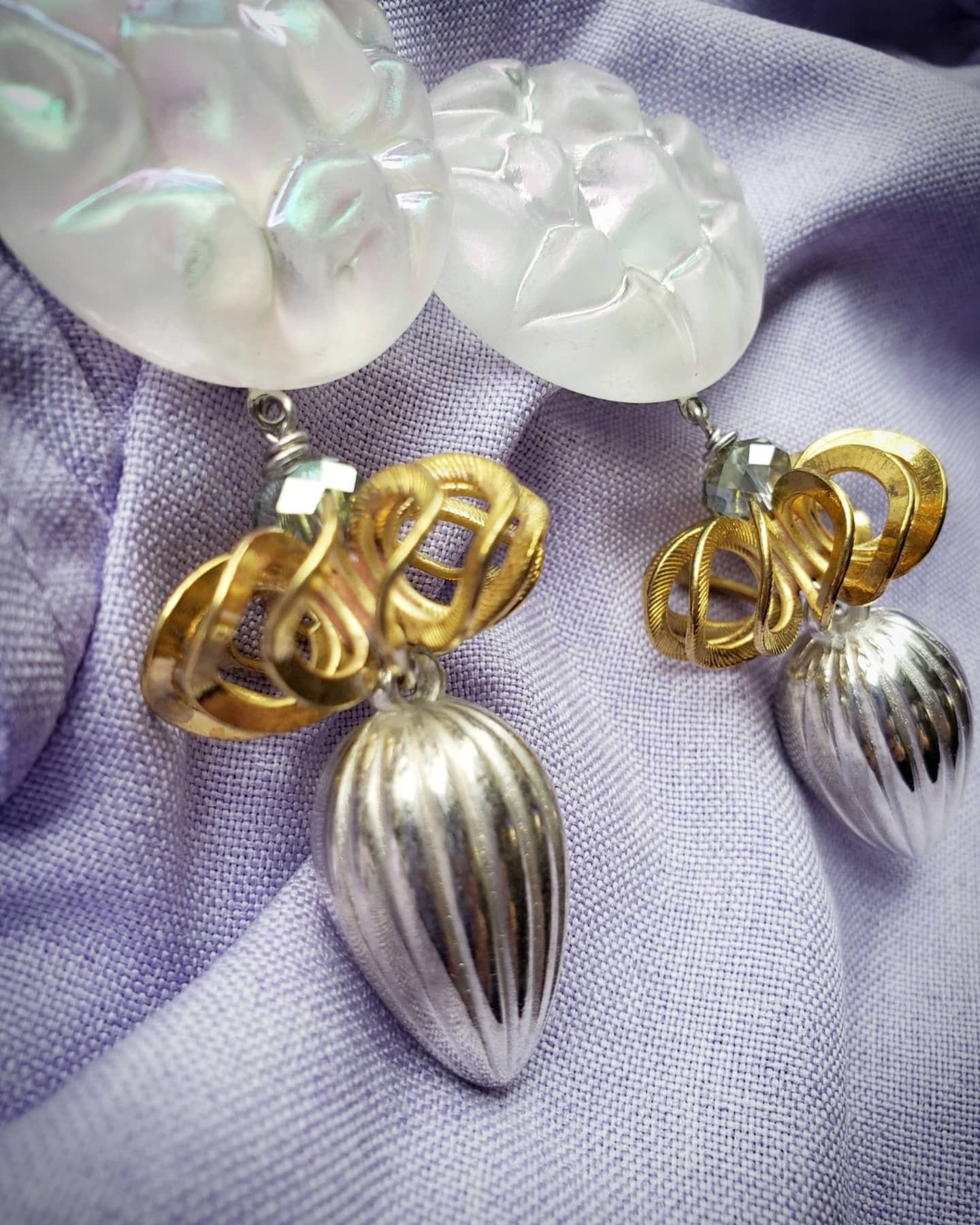 何度か登場しているオーロラフロストクリアのヴィンテージパーツと、個性あるフォルムとサイズ感が魅力的な真鍮ビーズを合わせて✨